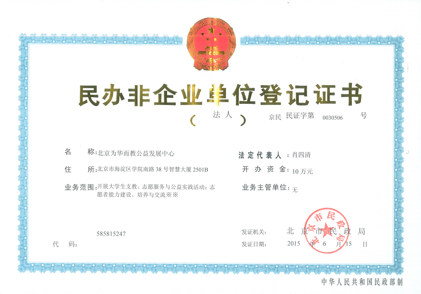 “为中国而教”(Teach Future China,简称TFC)成立于2008年,隶属于联合国教科文组织国际农村教育研究与培训中心,2014年5月在北京市民政局正式注册为民办非企业单位“北京为华而教公益发展中心”,与联合国教科文组织国际农村教育研究与培训中心联合运作“为中国而教”项目。