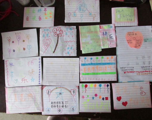 教师节那天,他们一个个脸上洋溢着快乐,调皮地问我:“老师,你有什么愿望?”我想了想,说:“你们上课安静下来,认真听讲就是我的愿望。”“老师希望我们安静下来,上课认真学习!”这句话马上传开了。出乎我的意料,那一天,他们出奇地认真,本来以为他们只是随便说说,不一定做得到。因为经过一个星期的观察,我发现他们非常好动,平时习惯不是很好,一时间很难纠正。而这一天,他们真的做到了。中午休息的时候,有人咚咚咚地敲我的门,我打开门,发现是班上的几个女生,“姜老师,给你的”,她们把几张手工贺卡塞到我手里,笑笑,没等我反应过来就不见了踪影。我轻轻打开,里面写满了祝福,那一天真的很幸福。