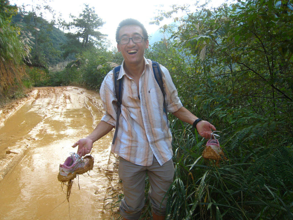 事实证明,经验主义的确需要我们从自己思想中根除。当我们坐上老乡的大容量、超舒适的五菱之光小面包,如同狂奔的蜗牛般以20迈的速度奔驰在用人命换来的山路上时,我才明白,字典里的“崎岖不平”这四个字只是一只吓唬人的纸老虎,这真正的崎岖不平的道路,才是“真老虎”。在不停的颠簸中,我的腰椎间盘震得快要突出,两条膝盖快被震酥,旁边一位妈妈怀抱里的娃娃快被震哭;终于快到了。旁边的队友显然也受到了瞬间腾空与地心引力相互作用的影响,表情略带痛苦而狰狞。我实在不忍,便提出侧目远眺窗外风景以分散注意力。但眼睛这东西实在是个好奇鬼,喜欢对没见过的东西随意乱看,于是我们在盘旋而上的公路上,像波浪鼓一般一会儿头颅向左,一会儿脑袋向右地欣赏着梯田、杉树这如画的美景,以及近在咫尺的悬崖乱石、万丈深渊。怕还是不怕?这根本不是个问题,答案是唯一的。